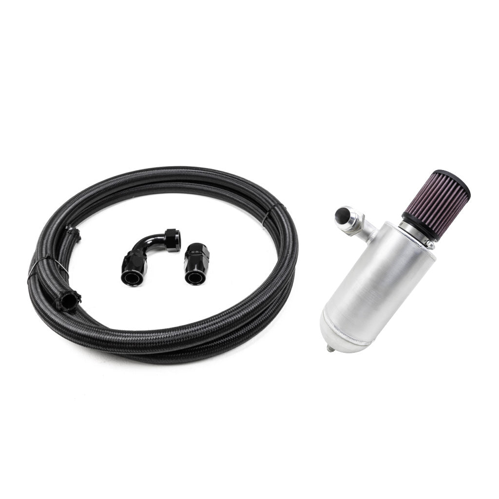 GT1R Methanol Crankcase Breather System with -20AN line included. 15′ long hose with 90° hose end, straight hose end, and ready to weld male -20AN bung sent on side for end user to fab/install. The tank uses a -20AN male inlet and a -10AN male drain.